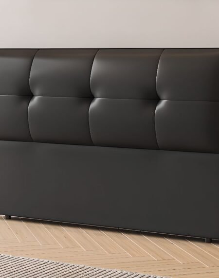 Lit moderne queen et king size, avec une tête de lit noire rectangulaire rembourrée en éponge et recouverte de cuir et tissu anti-griffes. Structure en bois, autonome, sans éclairage ni rangement, garanti 60 jours