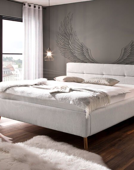 Chambre à coucher élégante, fabrication tapissier, revêtement en tissu de qualité, pieds en bois, équipée d'un coffre de lit ventilé et de deux sommiers rigides (90x200 cm chacun), offrant une surface de couchage confortable de 180x200 cm.